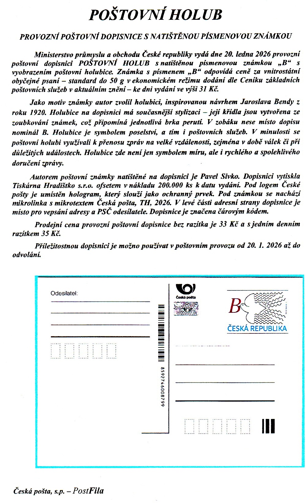 08.03.2026 - Na Blogu v článku "ČP-novinky v roce 2026" jsou přidány informace k hlasování o nejkrásnější známku roku 2025. Přečtěte, vyberte, hlasujte. Zájemci obdrží i pěkný suvenýr. V sekci Fauna-Flora jsou přidány další ukázky nových CDV s přítisky a zároveň s nimi i zajímavé povídání od pana docenta V.Zieglera.