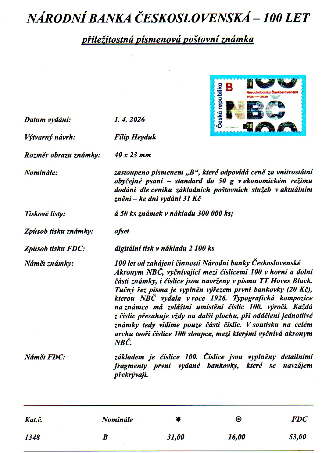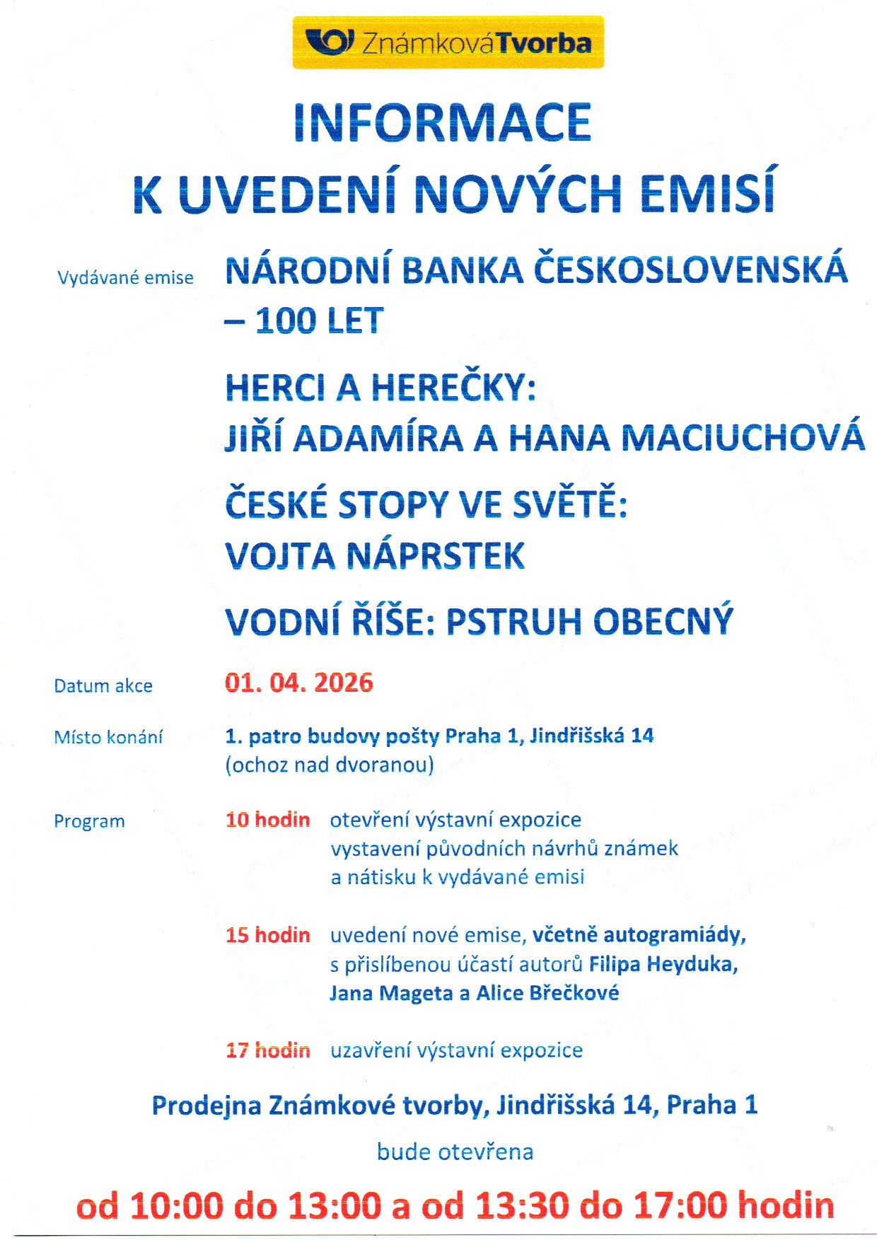 Upozorňujeme, že tato nabídka platí pouze pro zájemce o osobní odběr na přepážce č.30, prodejna Známkové tvorby, Jindřišská 14, Praha 1